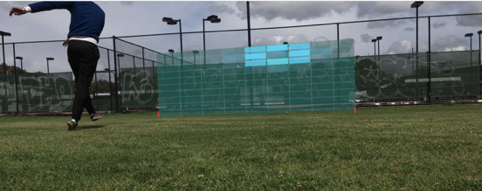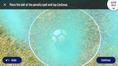 Before your eyes, the makeshift goals you created will turn into an aesthetically pleasing augmented target. From here the app instructs you to turn around in where a blue augmented cylinder appears as the penalty spot. The ball needs to be placed in it for it to be recognised and made into a ‘smart ball’. After that is done two similar styled red augmented cylinder appears diagonally, either can be selected for the phone and tripod to be placed for recording. When playing on uneven grass surfaces be mindful of the phone’s orientation. If the phone is tilted, it will result in the goals being wrongly projected on the screen.