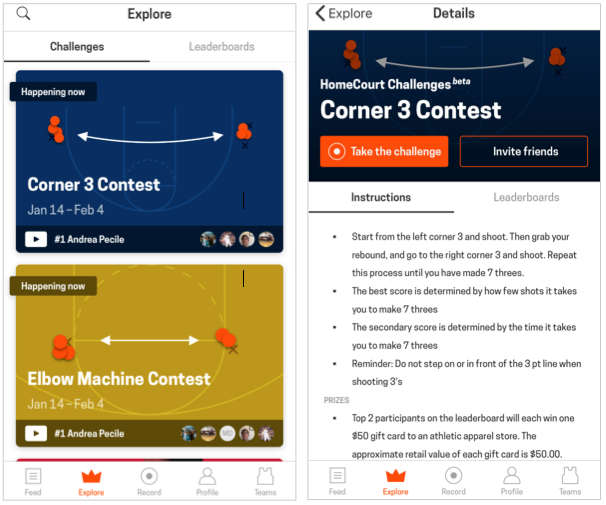 Challenges: If someone gets bored of just trying to make shots, they can check out the Explore tab which has some interesting challenges. Each challenge has specific instructions of what they must do (if they take up the challenge) such as standing on specific locations on a court, making a number of shots and possibly in the shortest time. Of course the session must be recorded using the App through the Challenge. Then a winner will be selected at the end of the challenge period and awarded a prize.