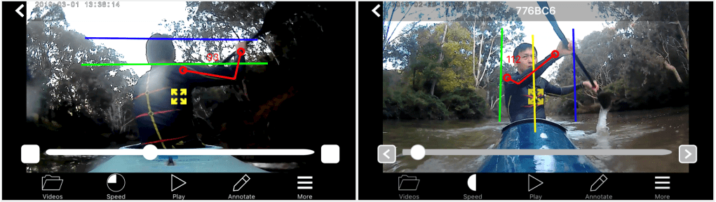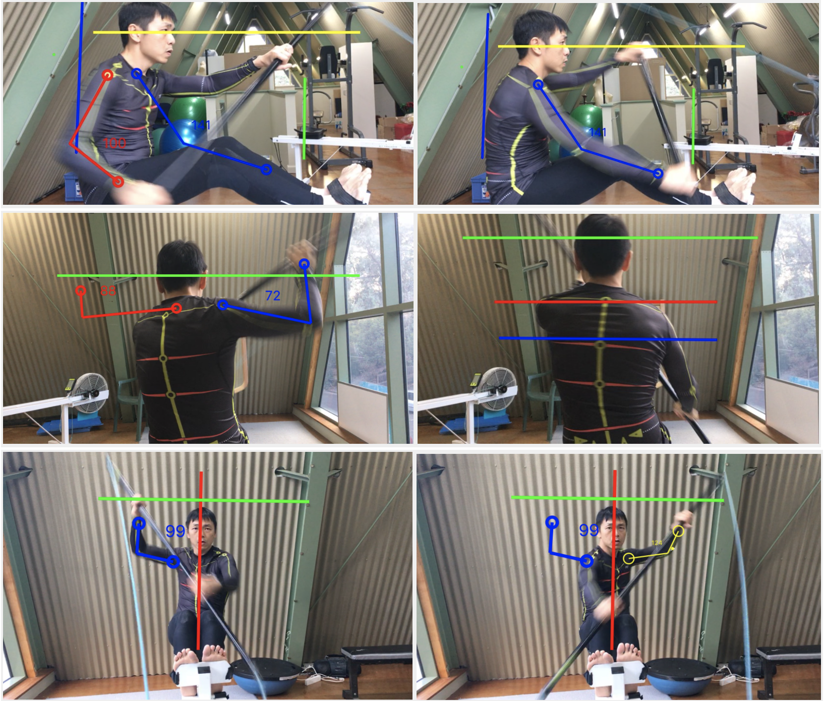 When paddling on the water, the options for video capture is more limited – I could either mount the camera in the front or the rear of the kayak. This gives me back and front views similar to when I am paddling on a ergometer. Except now, water is added into the mix, and the 3D forces I am working against are the real-deal and quite different from the ergometer. I can also see moments when my paddle blades and hands are entering the water and starting the “pulling” phase, and the corresponding joint angles and position relative to each other.