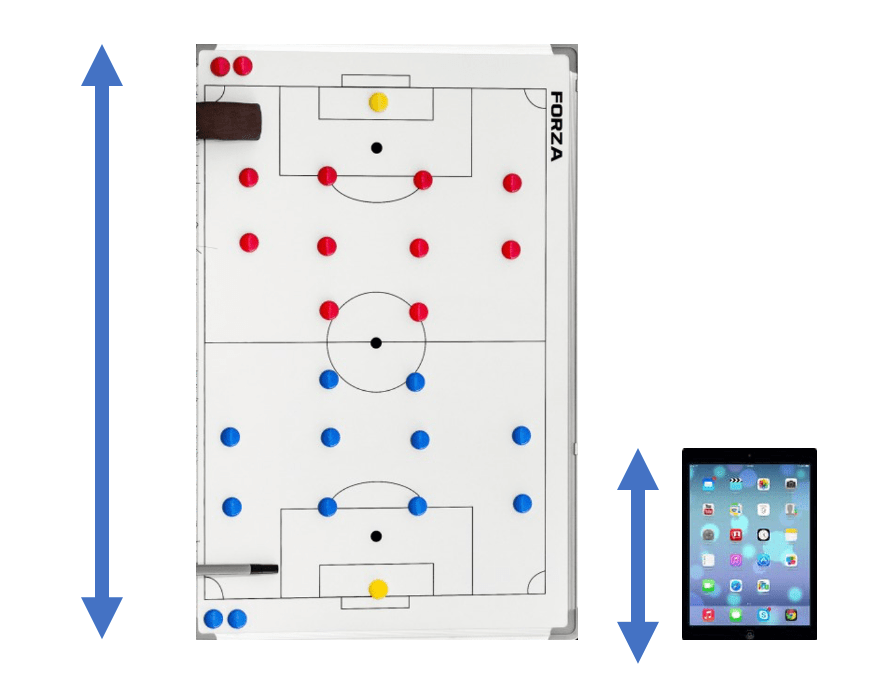 Despite the apps great functionality the biggest challenge we experienced was the screen size of the device. The iPad Air we used roughly had screen dimensions of 15cm x 20 cm where as a decent sized portable whiteboard is 90 x 60 cm. This disparity in size is made clear in the scaled comparison image below. Due to the iPads small size it makes it extremely difficult to display your drill or tactic to a whole team simultaneously. That being said this could be made more useful by connecting the iPad to a projector. However this would restrict use to only indoors and not on the training. Nonetheless working 1-1 with players or in small groups the iPad still worked effectively to get the message across of a drill. That doesn’t mean the app isn’t useful in a real world setting. We found being able to send drills as a clip to players prior to a session being a better use for this app when working with larger squads.