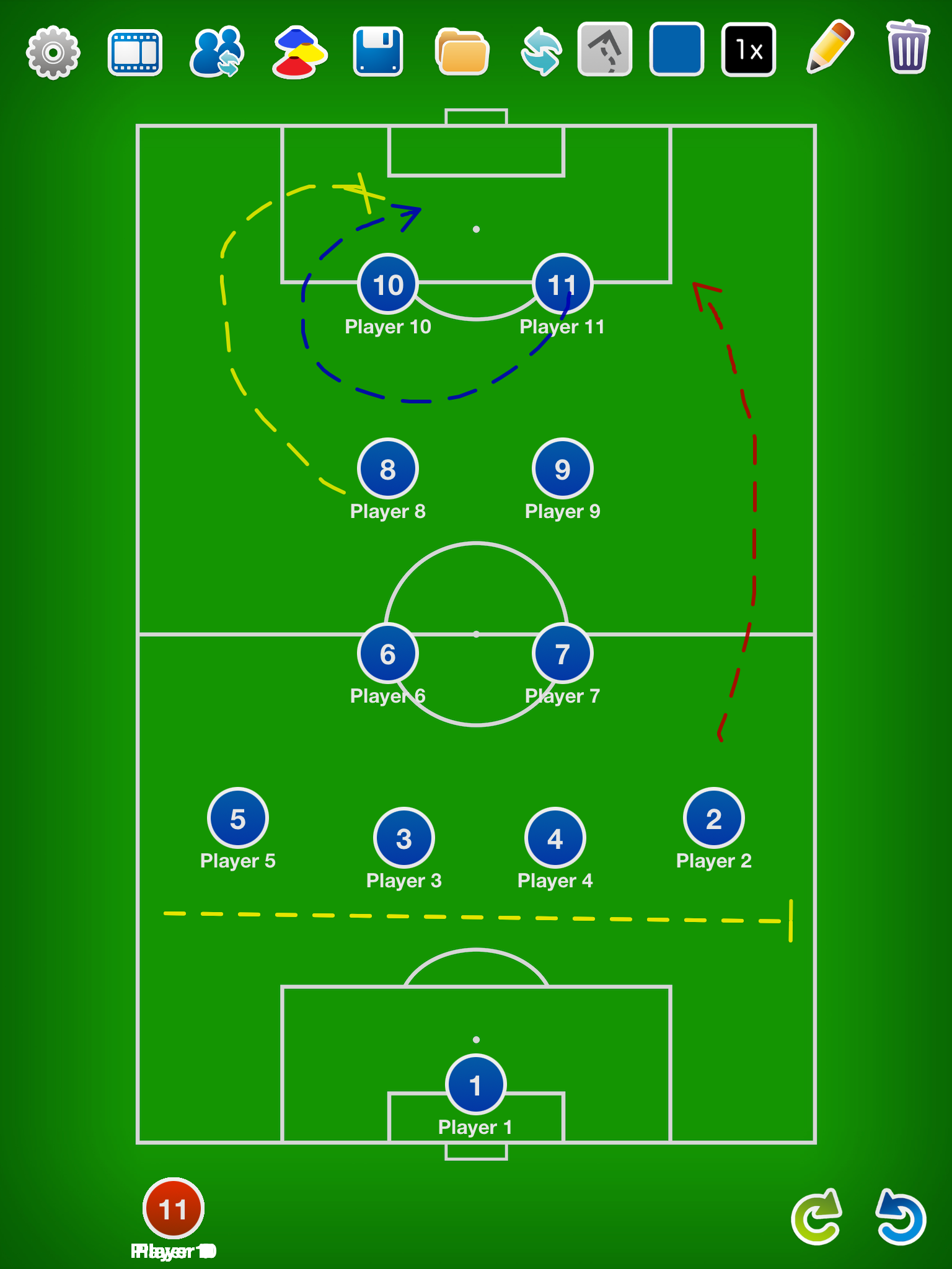 The home screen is setup like a whiteboard in the sense it is made up of a soccer field with markers which are used to represent the home team and opposing players. In this mode there is also the option for annotating the whiteboard with lines, selecting formation and adding player information.