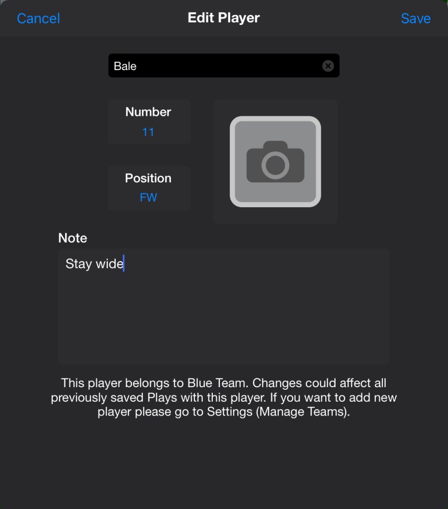 For each player on the screen there are several options to customise. Having names under the player markers is a useful feature to help identify squad members. There is also the option to differ from the single colour circle markers by changing them to images from your gallery. Though this is useful more often than not a one coloured marker is more practical for explanations as it is easier to differentiate between home and opposition teams. Specific positions can also be given with a player. However, we did find it a bit weird that they would refer to a Left Midfield as “ML” rather than the more common “LM” or a Central Defender as a “DC” rather than the more common “CB”. Nonetheless the number of options and convenience of customising players information is quite powerful.