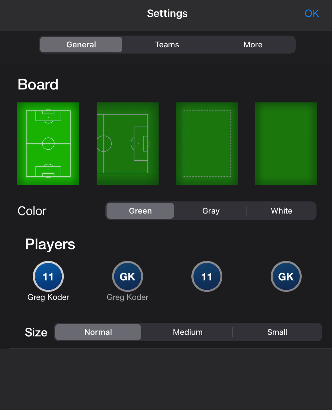 In the settings, the user has the option to select 4 different field backgrounds. These include a full-size field, a half-sized field, a square box and a plain field with no markings. The field colour can also be changed between green, grey or white. Player marker sizes can also be adjusted from normal(which is the largest), medium and small. These provide the user with more than enough options to setup a field for their dedicated purpose whether it be a drill or a squad lineup.