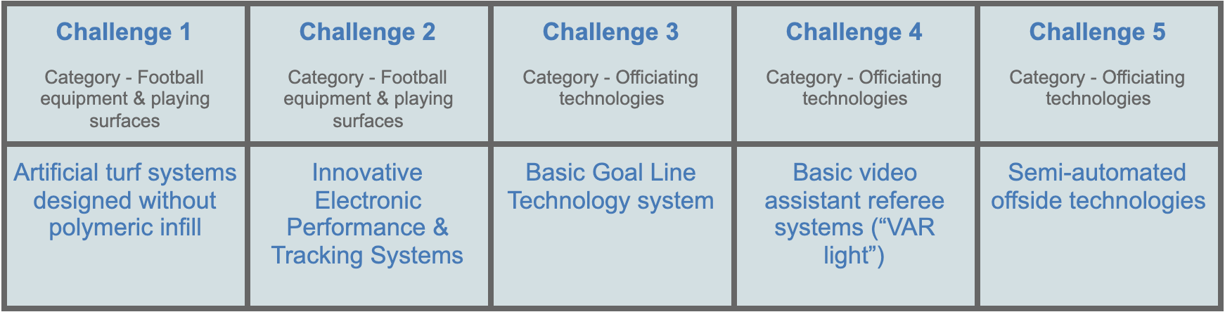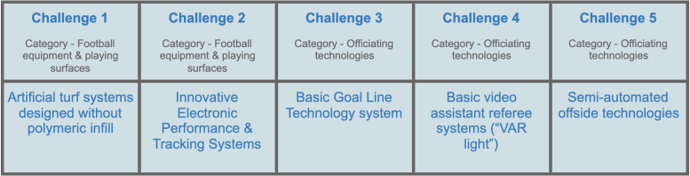 Now the five challenges are established based on collating and refining the needs currently faced by the football world and picking out the ones that can be solved through technological innovations. Interestingly, two of the challenges are about football equipment and playing surfaces and the other three are about officiating technologies.