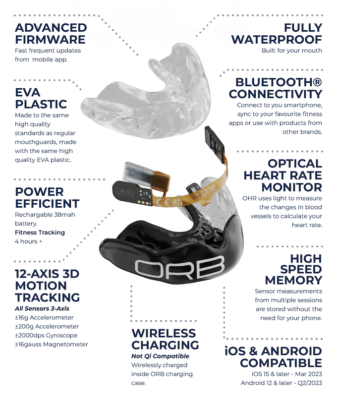ORB Smartguard by ORB Innovations is a custom mouthguard fitted with sensors that track the athlete’s performance and monitor for head impacts. It is the first mouthguard we know that does all these things. Founded by two engineers – Robert Paterson & Thomas Quinn, they started off wanting to create a smart mouthguard (or gum shield) solution for better diagnosis of head impacts and concussions in contact sports. They soon realised that the sensors that collect data from head impacts could also be used for movement tracking and performance analysis. Besides having the impact (High-G Accelerometer) and motion tracking sensors (standard 3-axis accelerometer, gyroscope and magnetometer), they also included an optical heart rate sensor and Bluetooth connectivity to stream all that data to a user’s smartphone.
